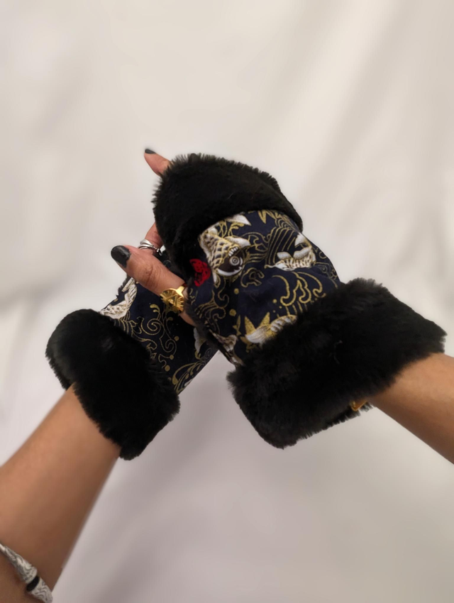 Mitaines noires et tissu japonais carpe